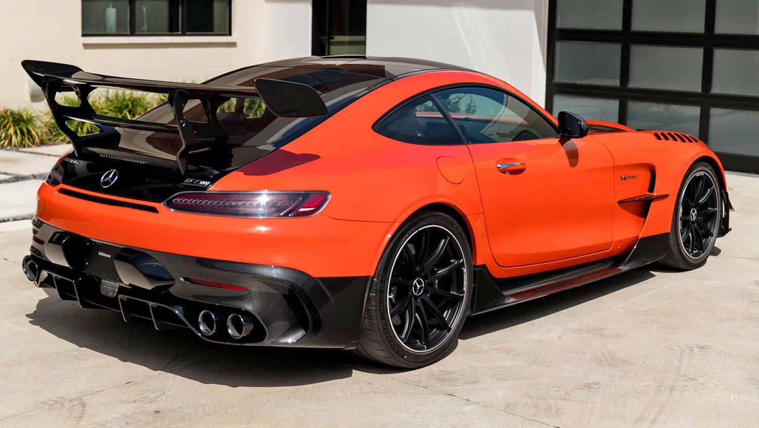 This 2021 Mercedes-AMG GT Black Series has 1,200 miles, a 720-hp V8, carbon-fiber trim, and Magmabeam Orange paint. With ceramic brakes, forged wheels, and a dual-clutch transmission, it blends track-ready engineering with luxury appointments and modern tech.