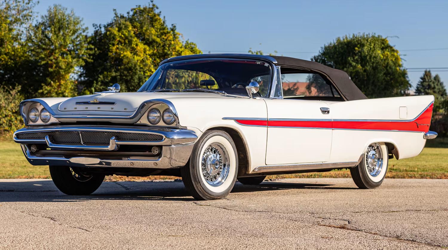 DeSoto’s 1958 lineup embraced the jet-age aesthetic with sculpted body lines, large chrome bumpers, and bold color combinations. The Firesweep Convertible in white and red stands out with its dramatic presence and refined proportions. Fender-mounted mirrors and polished wire wheels add a touch of elegance, while the power-operated convertible top enhances its luxurious appeal.