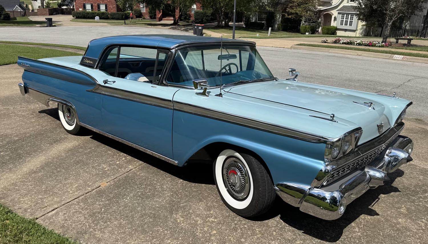 This particular 1959 Ford Fairlane 500 Skyliner, offered as Lot S177 at the Dallas/Fort Worth 2025 auction, has undergone a complete frame-up restoration. Originally a California car, it retains its authentic charm with factory-correct finishes and meticulous attention to period details. The blue exterior and matching interior emphasize the model’s graceful lines and mid-century aesthetic.