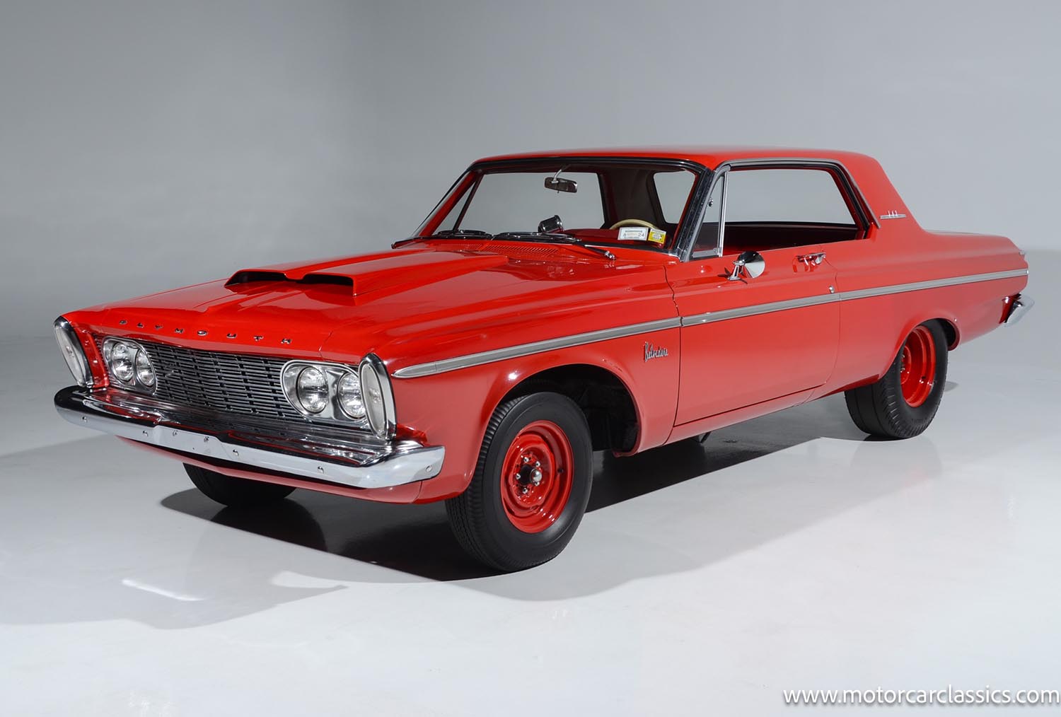 Finished in brilliant red with a matching red vinyl interior, this 1963 Plymouth Belvedere exudes confidence and character. The two-door hardtop body highlights the clean lines and minimalist styling that defined early-1960s Plymouth models. Its red steel wheels complement the bodywork, giving the car an unmistakably purposeful stance.