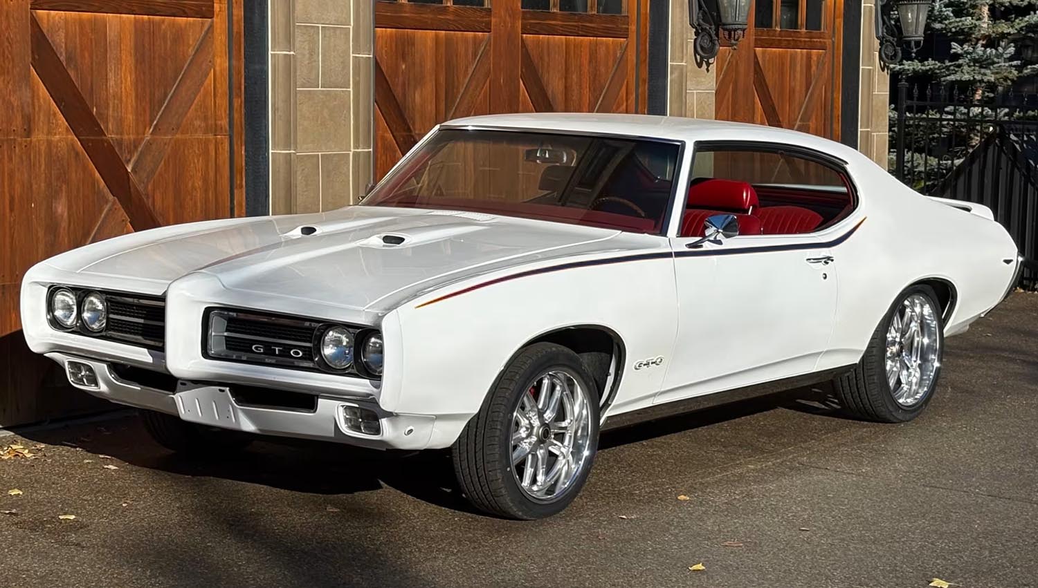 The 1969 Pontiac GTO Pro Touring heads to Las Vegas this November, bringing a modernized muscle formula to the auction stage. Finished in white with a red interior, this coupe blends classic lines with contemporary performance upgrades.