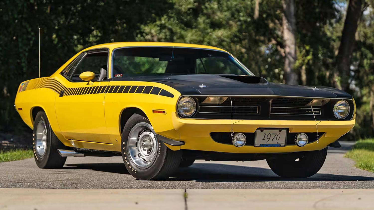 Previously part of NASCAR legend Ray Evernham’s private collection, this Cuda retains original sheet metal and FY1 Lemon Twist paint. Only 1,120 factory 4-speed AAR Cudas were produced.