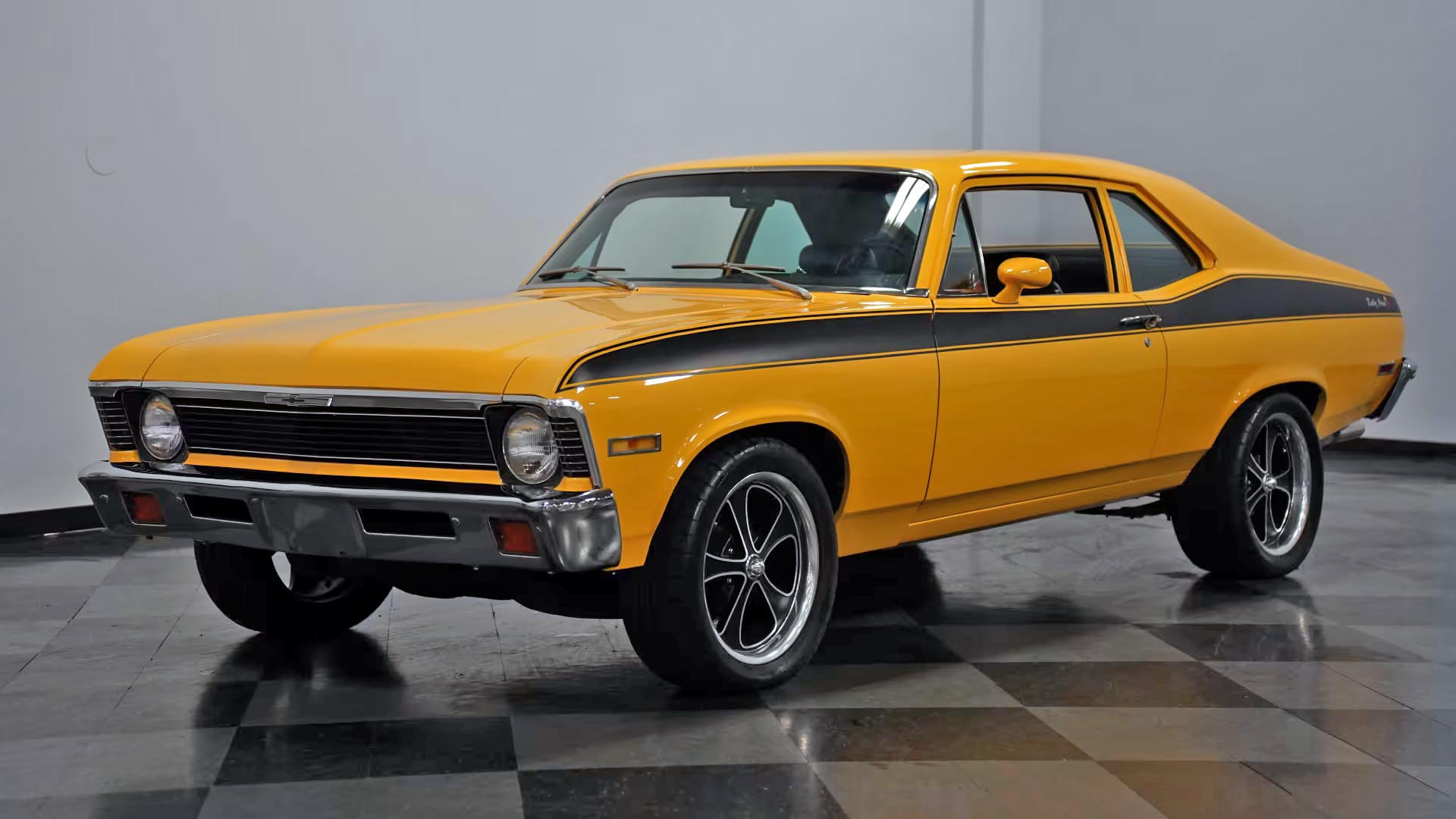 Some cars don’t need introductions. This 1971 Chevrolet Nova Coupe in Yellow with Black Rally striping already says plenty before the engine turns over. Restored in 2019, it carries a street-era look with updated parts and a clean finish.