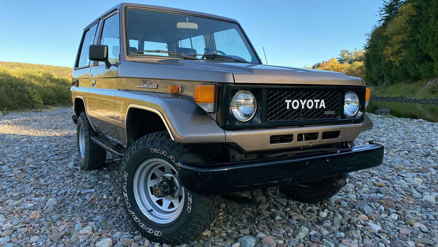 Built for resilience, the Land Cruiser rides on 15-inch steel wheels wrapped in Goodyear Wrangler 235/75 tires. It features manually locking front hubs, semi-elliptic leaf springs at both ends, and front disc with rear drum brakes. The seller notes that the brake proportioning valve requires replacement, with a spare included in the sale.