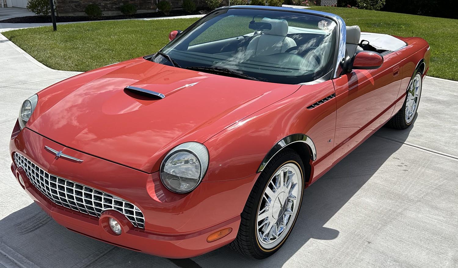 In summary, this rare 2003 Ford Thunderbird 007 Edition offers a unique combination of collectibility and cruising appeal. Its exclusive Coral finish, Performance White leather, and Borla exhaust make it stand out. The car remains a well-maintained, low-mileage example of the special series. With its recently serviced V8 and smooth automatic transmission, it is ready for top-down enjoyment.