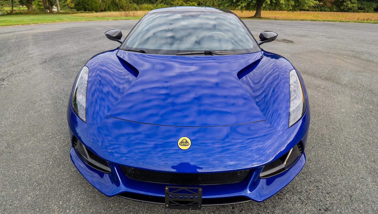 The Emira wears TCA Ultra Lite composite bodywork over a bonded aluminum chassis, carrying design cues from the outgoing Evora GT. Atlantis Blue paint is complemented by the Full Black Pack and carbon-fiber roof, rear diffuser, mirror caps, side intakes, and bumper cover inserts.