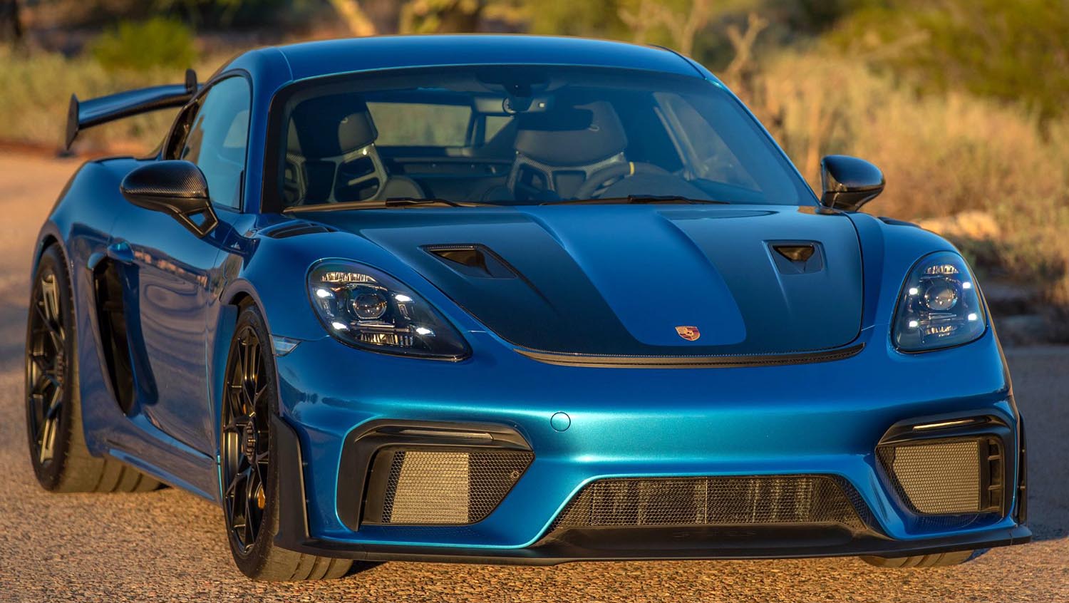 This GT4 RS also features vented front fenders, LED headlights with Porsche Dynamic Lighting System, and auto-dimming mirrors with integrated rain sensors. Finished in South Sea Blue Metallic, the car’s fluid lines are complemented by carbon-fiber window triangles, a rear diffuser, and dual center-exit exhaust outlets.