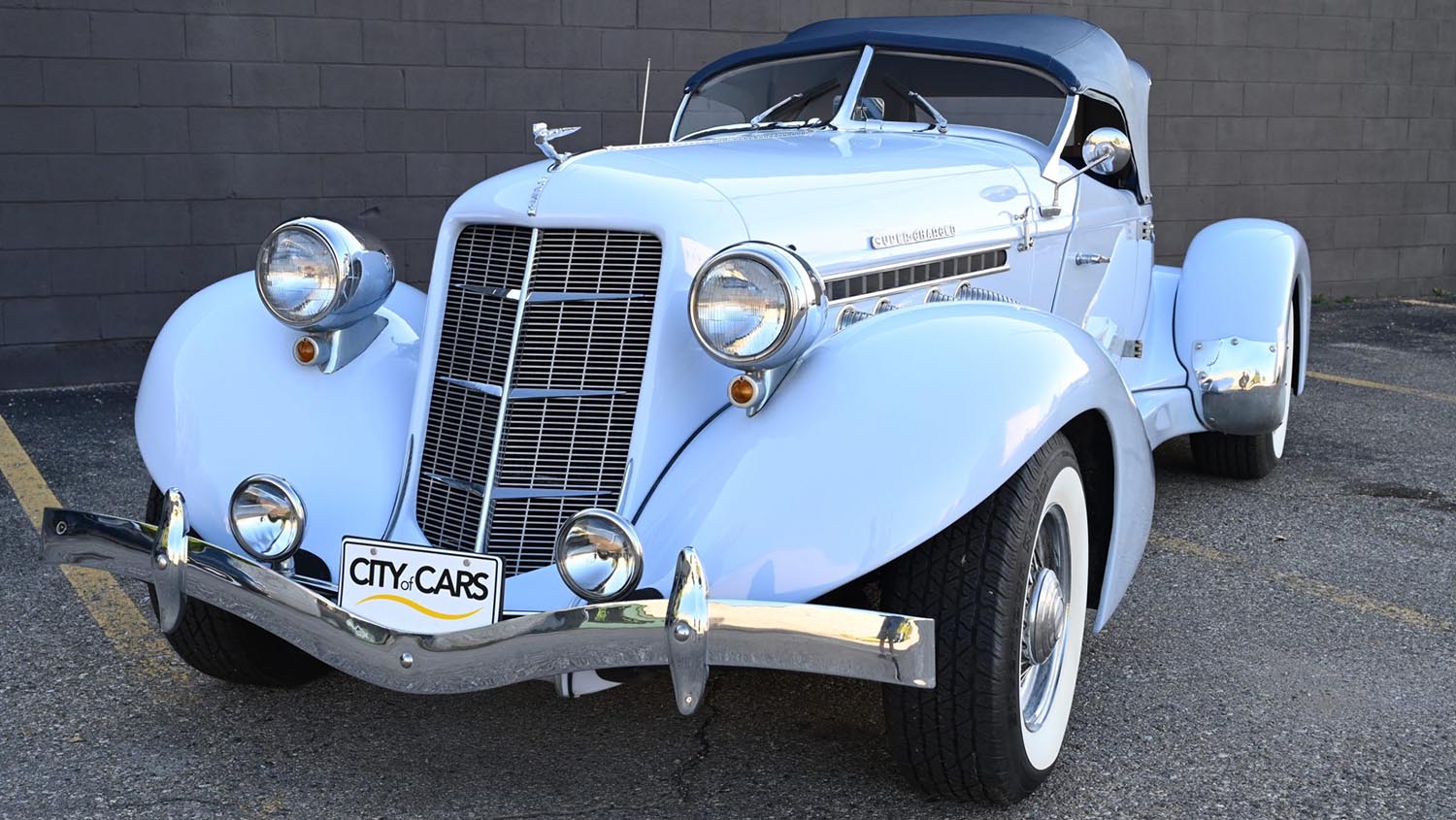 The Auburn Boattail Speedster Replica by Elegant Motors showcases vintage style with modern reliability. Built over a tubular steel frame, its blue fiberglass body captures the spirit of 1930s Auburn designs. This replica has been with the current owner for approximately ten years and remains highly collectible.