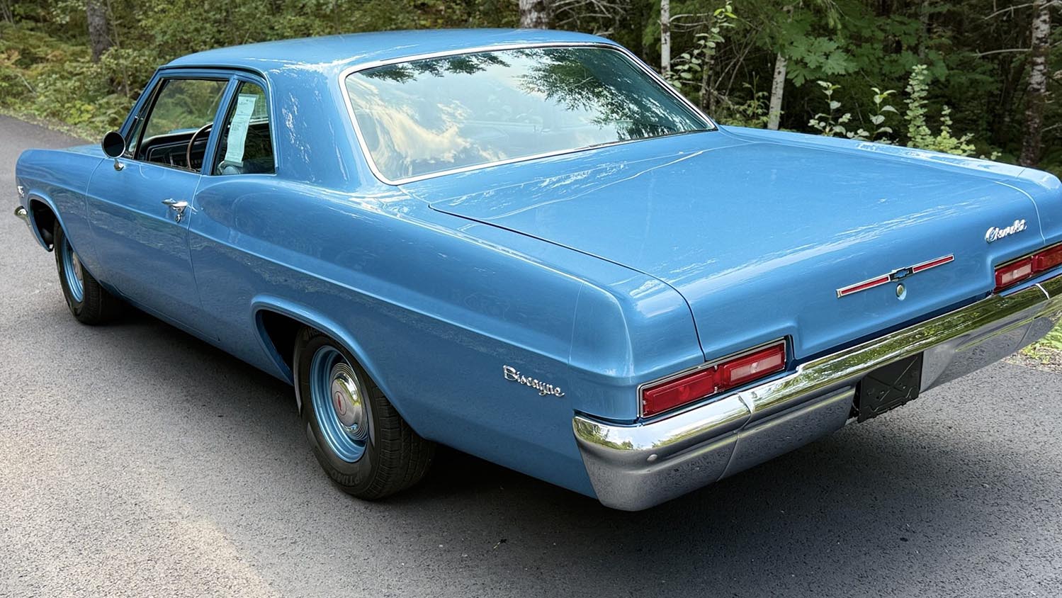 This modified 1966 Chevrolet Biscayne two-door sedan is an excellent example of period muscle. The handsome Marina Blue finish is a great improvement over its original color. Its potent L72 427 V8 engine delivers impressive performance. Paired with a rewarding Muncie four-speed, this Biscayne is a wonderful enthusiast machine. It combines the clean lines of a classic full-size sedan with big-block excitement. It is ready for the road with its current owner since spring 2025.