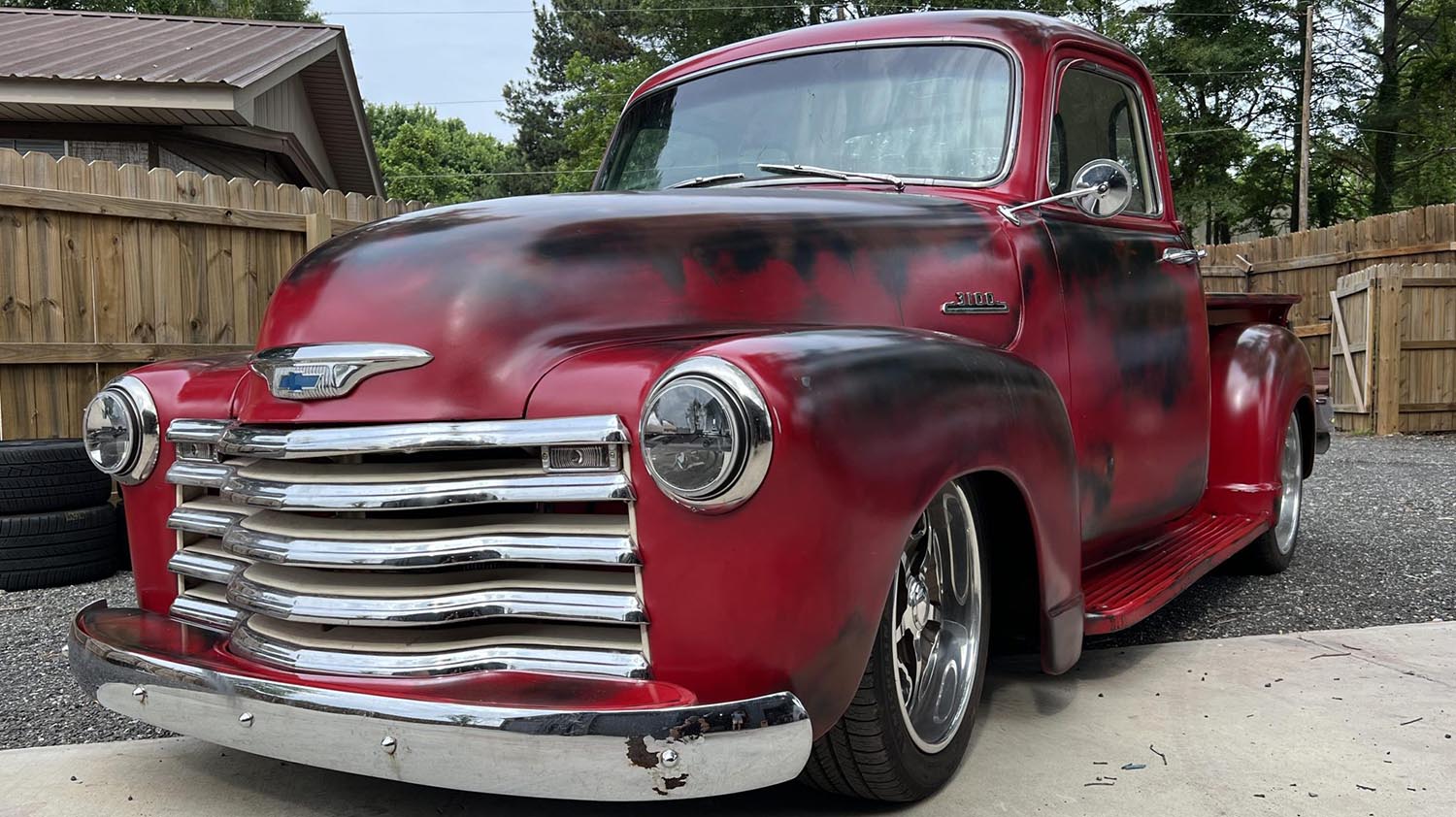 This 1954 Chevrolet 3100 Pickup wears a bold faux distressed red finish. Curved rear quarter windows and a chrome grille add authentic 1950s charm. LED headlights, running boards, and single-piece side windows highlight a tasteful combination of classic design and modern functionality. Turn signals and chrome bumpers complete the nostalgic exterior package.